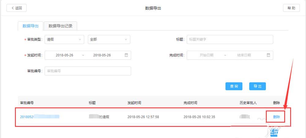6、进入数据到导出后我们能看到很多选项。只要选择好想要导出的项目,项目状态,发起申请时间或完成时间,也可以直接用编号及标题来搜索。设置好相应数据后点击下面的查询