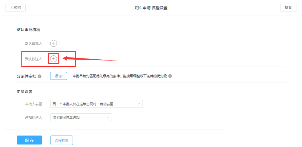 6、不同部门人用车需要不同人员审批就要用到分条件审批了,点击分条件审批后面的添加就可以在弹出的界面里设置。暂时只可以按申请人来分类,二图上面的小红框里可以指定多个申请人或部门,下面的小红框里可以设置相应的审批人和抄送人。设置好后记得点击保存