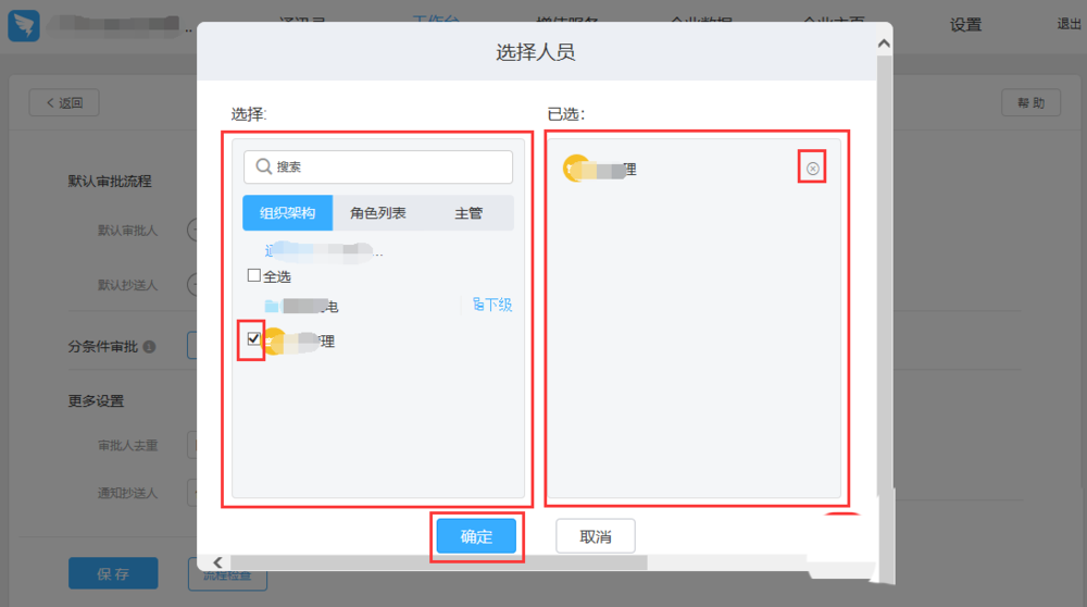 5、再来设置抄送人,也就是审批通过后要通知的人,也就是开头所说管钥匙的人。点击默认抄送人后面的小+号就可以在弹出的小窗里选择了,从左边红本框里的组织架构里找到需要抄送的人名字。在名字前点上勾,选错了或后期修改可以点击右边红框里人名后的小叉就可以删除。最后点击下方的确定。