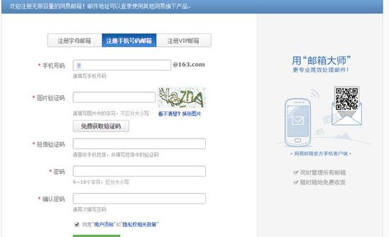 5、将从网易邮箱大师跳转到网易邮箱网页端,选择最简单的“注册手机账号邮箱”,填写自己正确的手机号、短信验证码和密码,即可完成注册,如下图: