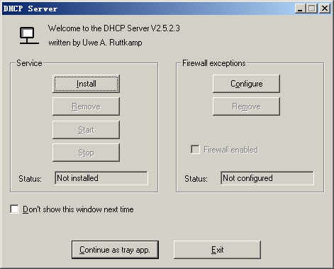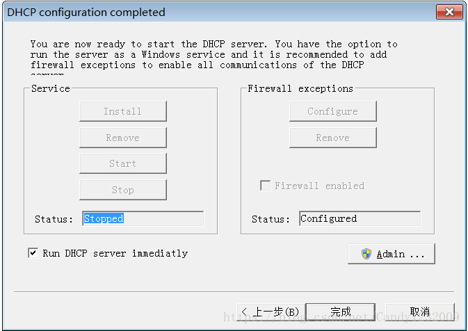 勾选 Run DHCP server immediatly , 并点击 Admin... 按钮以管理员身份运行。