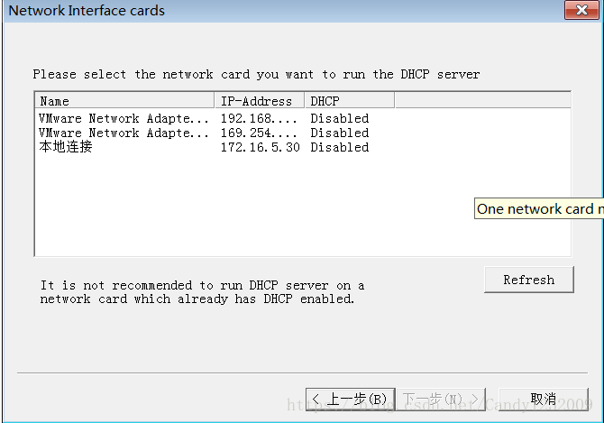 点击 下一步, 如下图, 选择要运行 dhcp server 的网卡。