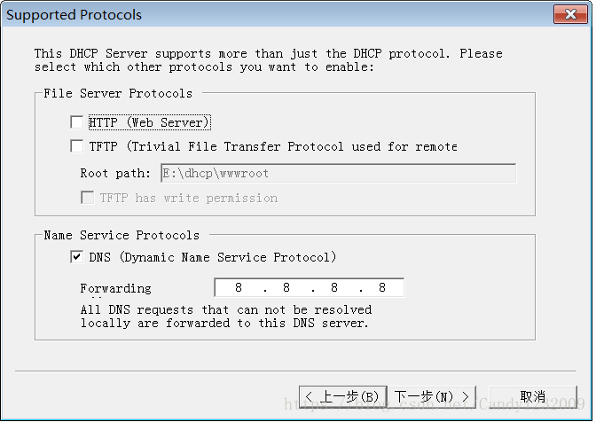 点击下一步。如下图。该软件还可以用作 http server, 如果不需要可以不用设置。 配置 dns 信息, 点击下一步。