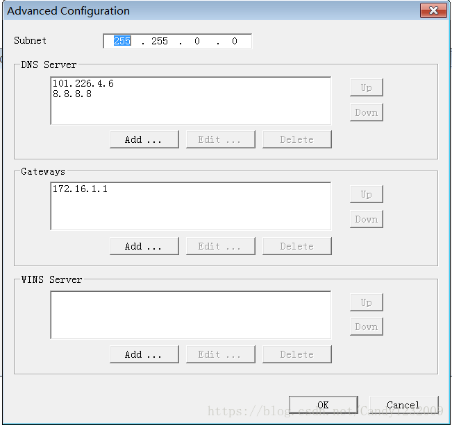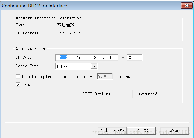 配置 IP 地址池, 这个地址就是 dhcp server 下发配置的范围。选择 dhcp server 的 renew 周期。 如果需要配置 dhcp option 相关信息, 点击 dhcp Options ... 按钮, 如果不需要可以跳过。点击 Advanced ... 按键配置子网掩码和网关等信息,如下图:
