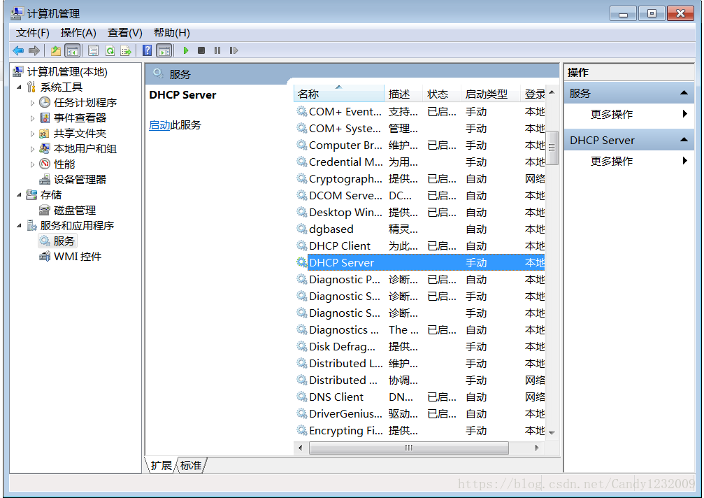 PS: 配置完之后, 下次开机是默认运行的。 如果不行默认开启, 可以在 开启菜单->计算机 右击, 选择 管理 进入计算机管理界面, 如下图。 在服务中查找 DHCP SERVER 改成 手动启动即可。