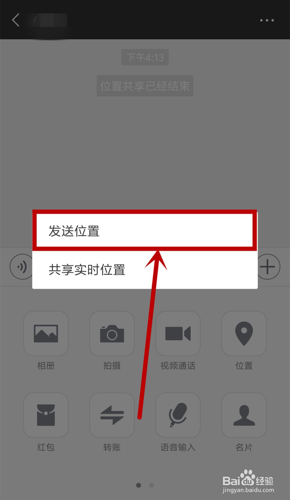 2、点击【位置】之后会出现两个选项,【发送位置】和【共享实时位置】,我们点击【发送位置】,(后面这一项就是让好友实时查看位置,一个静态一个动态)