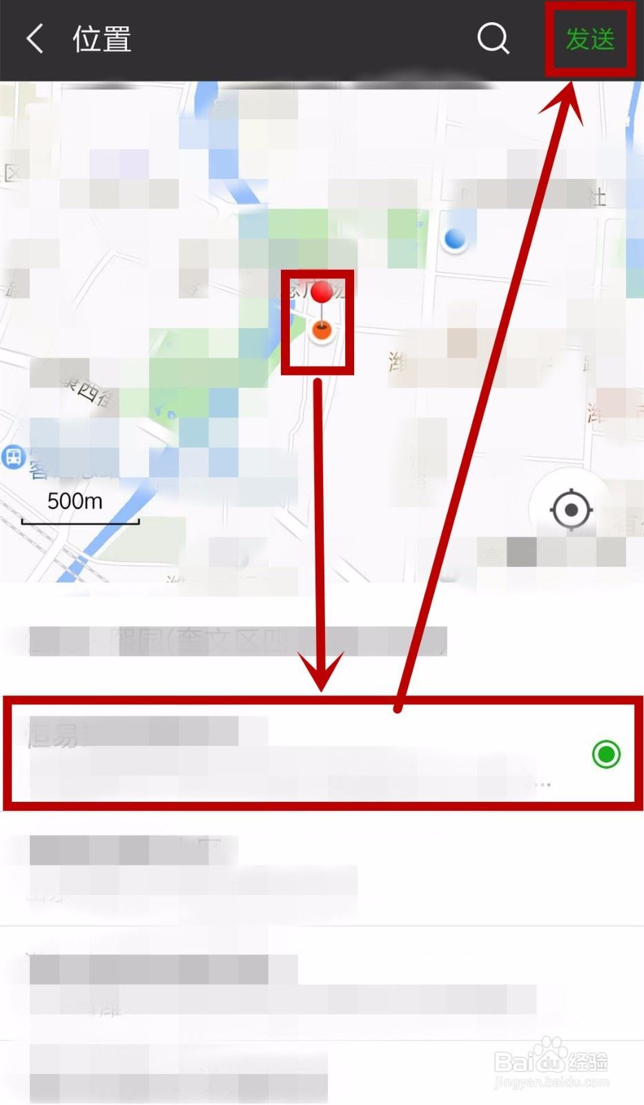 3、进入【位置】界面后,首先显示的是当前位置,直接点击右上角【发送】就可以发送位置给好友;有时候我们需要发送非当前位置,就需要在地图上找到我们要分享的地址用小红点标记,点击下方搜索出来的详细地址,这时地图上的小红点下方就会出现一个红点,表明我们可以发送此地址了,点击【发送】就行了
