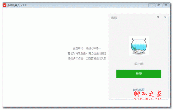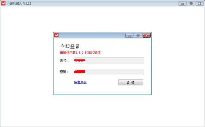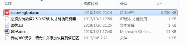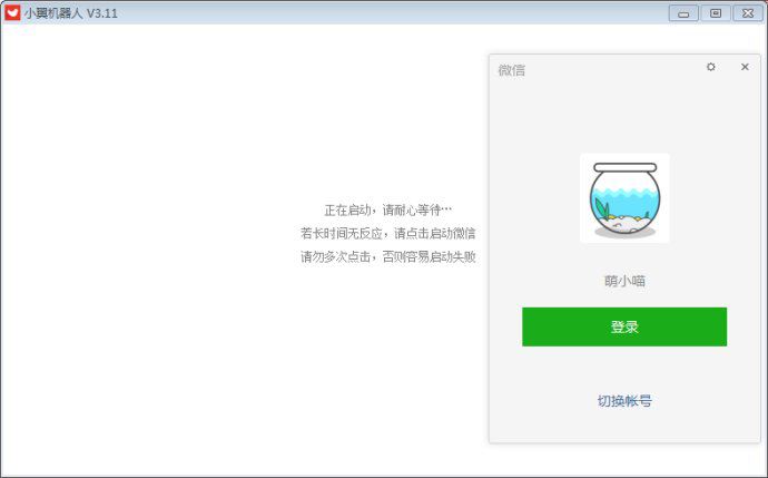 2)双击机器人软件,启用。软件自动打开微信(如果没有安装指定官方版本2.5.0.67,请先下载安装)