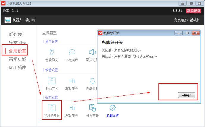 2. 私聊总开关:关闭后,机器人不再与任何人私聊