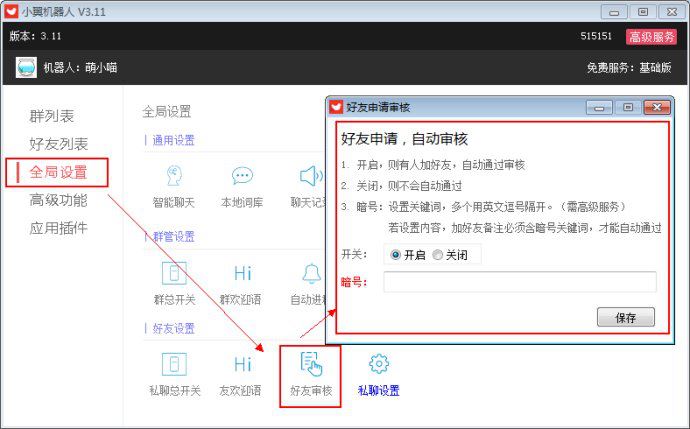 4) 暗号入群:设置暗号后,当好友与机器人私聊,发指定暗号,机器人自动邀请该好友进设置的群。
