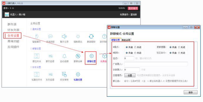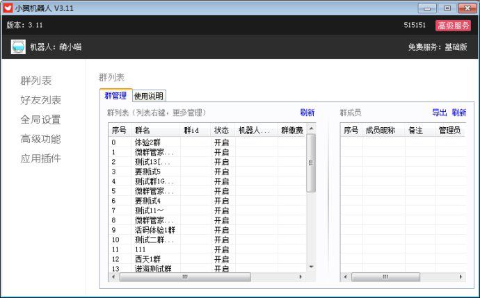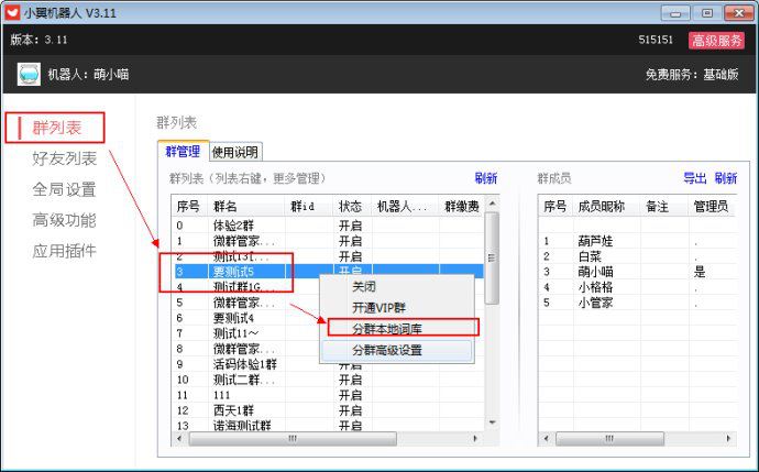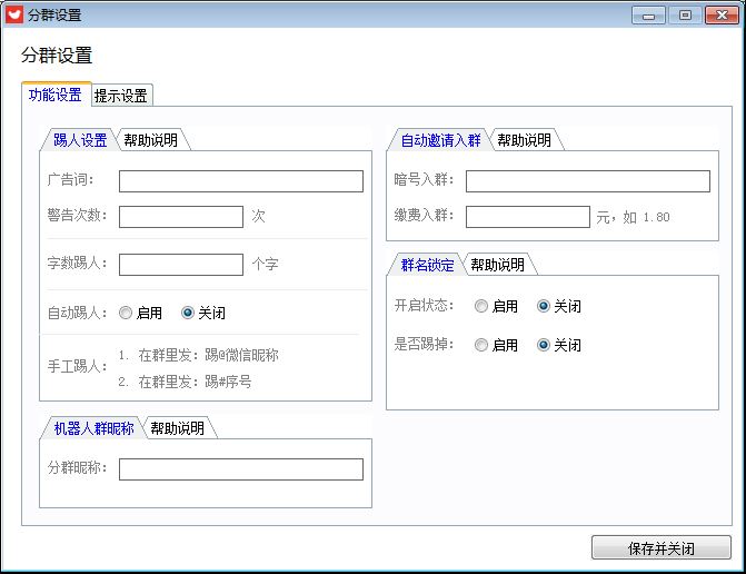 9. 分群设置:每个群都有独立的设置内容(踢人功能,机器人必须是群主)