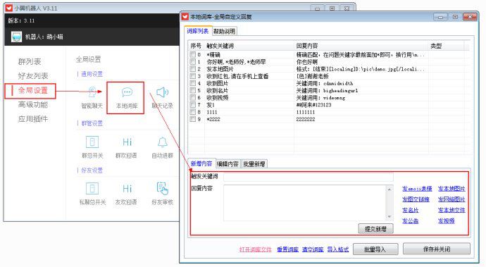 7. 本地词库:自定义聊天内容,设置后,不需要@机器人昵称,只要有人发的消息包含内容,则自动触发本地词库的回复内容。(与好友私聊公用)