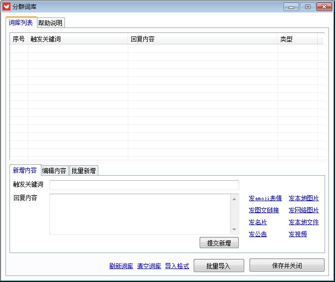 5. 本地词库:自定义聊天内容,设置后,不需要@机器人昵称,只要有人发的消息包含内容,则自动触发本地词库的回复内容。(与群内聊天公用)