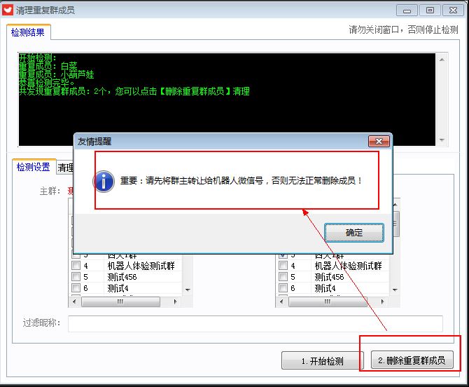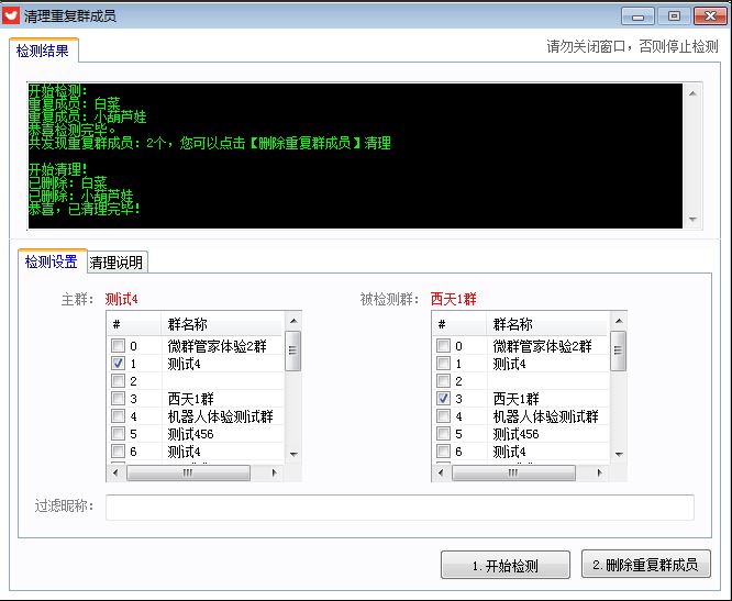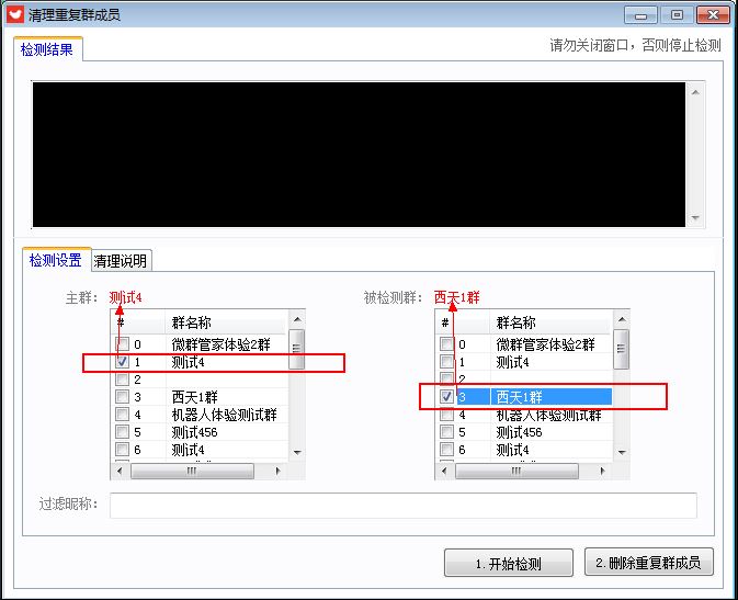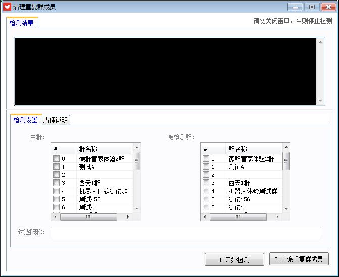 注意1:【主群】与【被检测群】不能选择一样的群,否则无法检测。