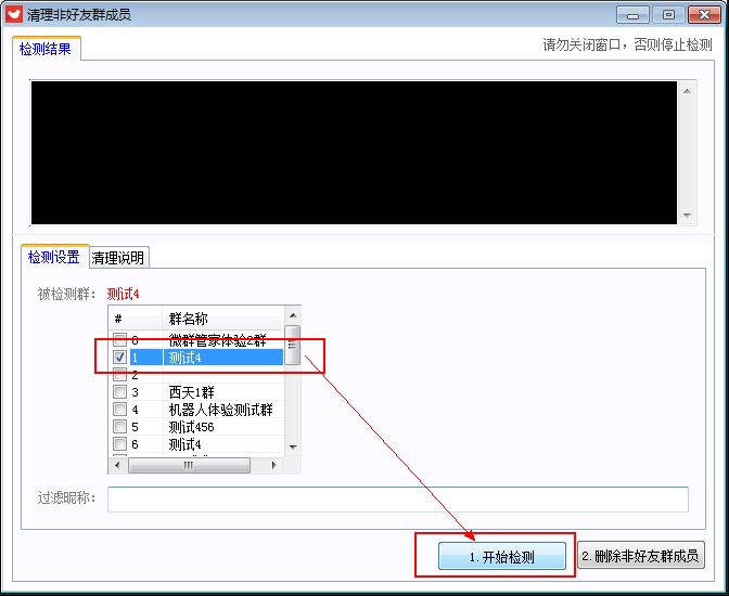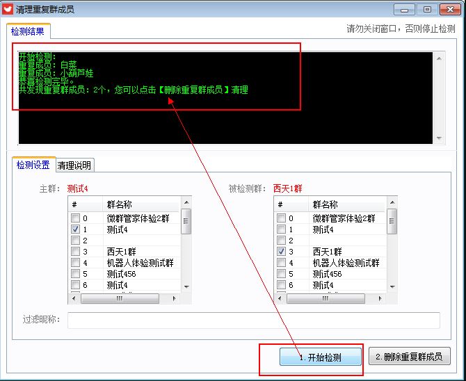 1. 先检测,再删除,如果检测结果不满意,可以输入过滤昵称,重新点击检测,即可