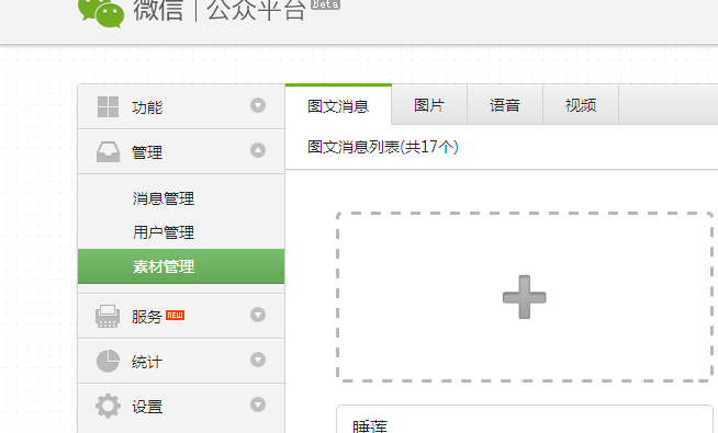 1、登录微信公众账号的后台,在管理中选择素材管理。