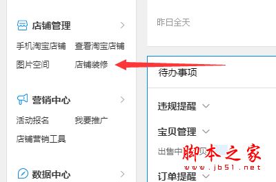 2、在界面的横向工作栏中选择店铺管理,找到【店铺装修】选项。