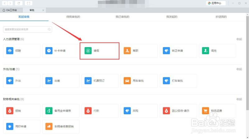 在菜单栏中选择“发起审批”,在发起审批的功能选项中选择“请假”功能。