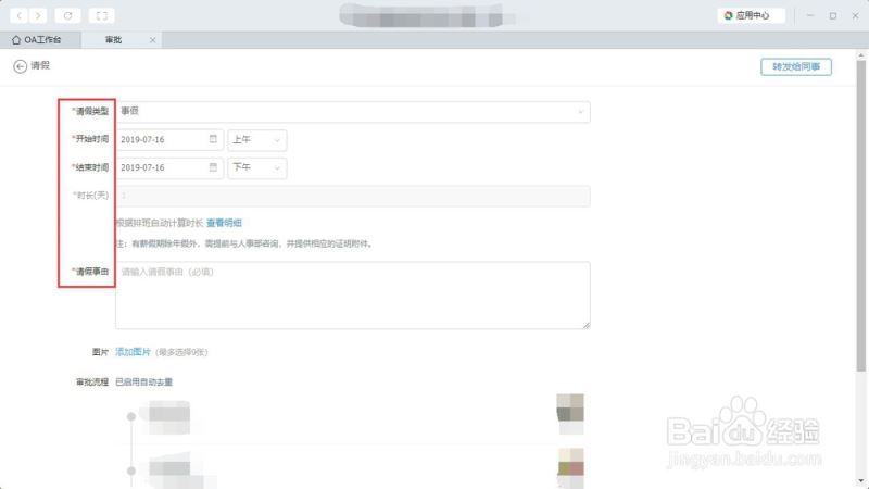 带请假审批页面中,带星号处都是必填的,请假类型、时间、请假事由等。