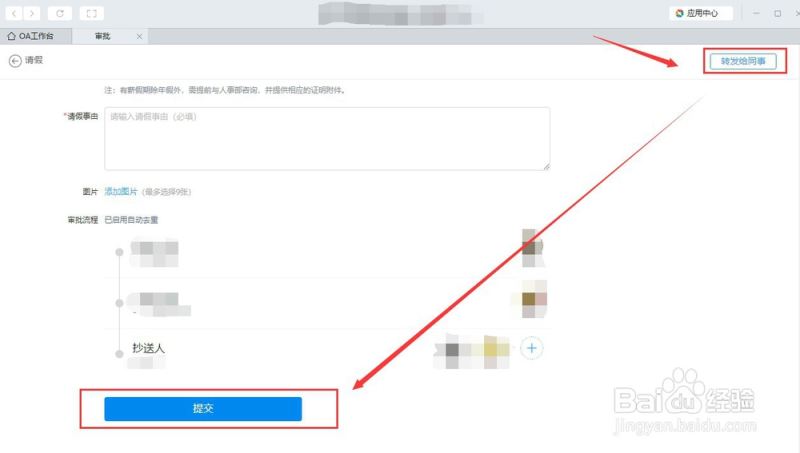 请假是否要让同事知道,方便他对接你的工作,如果需要则点击上方“转发给同事”,选择联系人即可。