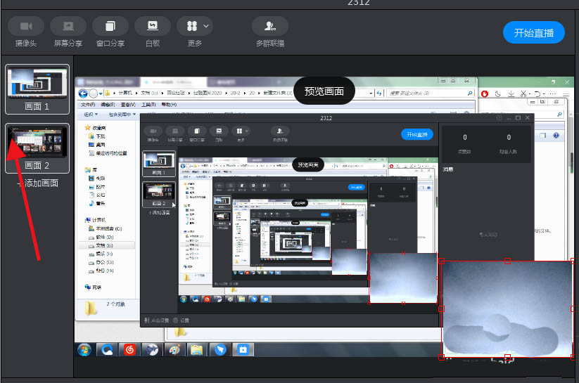 5、然后鼠标放置在画面2上,左上角会显示“X”出来,点击即可。