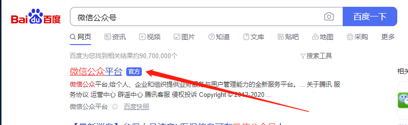 1、进入百度,在百度搜索栏中搜索【微信公众号】