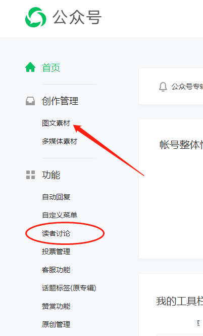 2、登入你的公众号,看到多了【读者讨论】的功能,我们点击【图文素材】