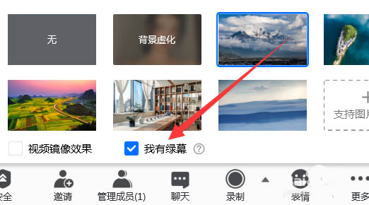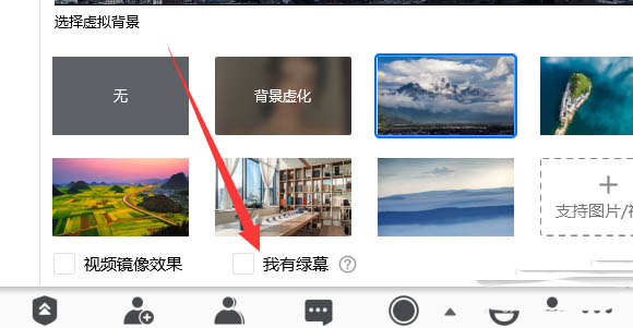 5、在虚拟背景设置界面底部可以勾选绿幕。