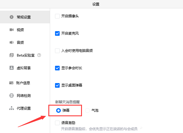 3、在设置中心【新消息提醒选项】点击【弹幕】开启。