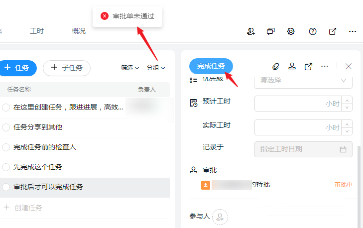 7、点击【完成任务】时就会提示“审批单未通过”