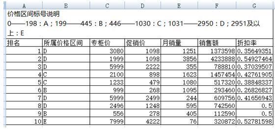 为了方便统计,我们对价格区间(来自于淘宝搜索)进行了标号列示。然后销售额的计算是销量*促销价,折扣率的计算是促销价/专柜价