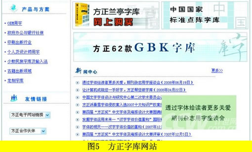 除此之外,网站的各内容区块应切割明显,让用户能很容易地判断内容块的起始。如果不是门户类型网站,网站页面长度尽量不要超过三屏(因为不同显示器分辨率参数不同,三屏的说法不一定适用于所有设计),即不要让用户在同一页面上过多滚动鼠标滚轮。中文网站设计时应注意内容区域文字尽量使用12像素、14像素等偶数字号,以准确表达中文字体的整齐切割,正文汉字部分应严格使用宋体,保证用户最好的阅读感受。标题部分可以稍微增大字号,页面上除装饰性图片或广告之外的地方最多使用两种字体。如图5所示的方正字库网站,就是一个很好的例子,左侧列表使用13像素宋体,右侧列表使用12像素宋体,同时除广告外还出现了黑体和行楷等数种字体。