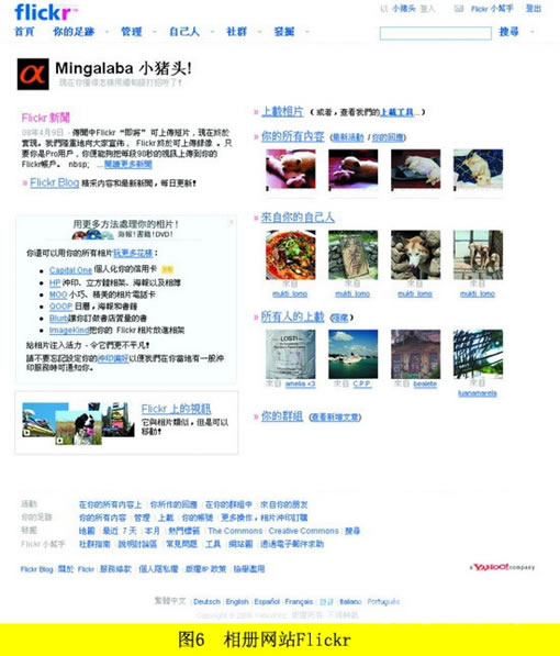 通过以下几个例子我们可以很好地对比简单和复杂的网页设计所体现的不同效果:如图6,互联网上最著名的相册Flickr,采用了最简约的设计;图7,中国SNS的典型代表校内网,以色块和线条构成主体,网站结构上极少使用图片;图8,安徽省政府网站,首页使用了极少见的纵向4栏分割设计,极其烦琐。