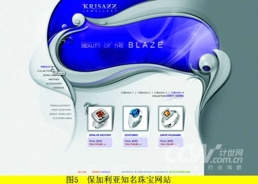 我们可以通过以下几个例子具体了解一下线条和形状的实际应用,图3是功能型网站校内网,直线为主的同时应用了不对称形状;图4是专业类网站蓝色理想,全站都采用了直线设计;图5是保加利亚知名珠宝网站,曲线的使用达到淋漓尽致。