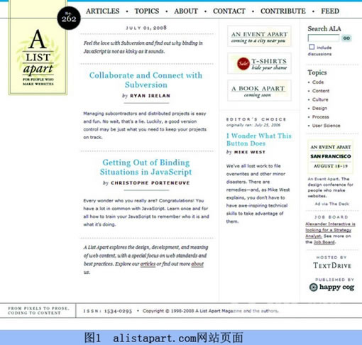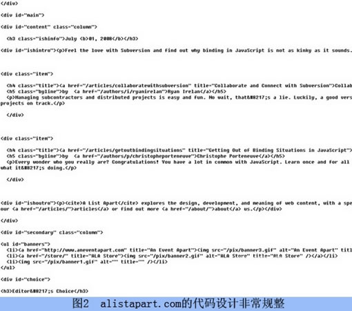 其次我们了解一下DIV中类的复用,同一个页面中,DIV的ID是唯一的,表示该页面上独一无二的一种特定表现;而CLASS(类)是可以无限重复使用的,表现该页面上有某些属性相同的若干区域,所以DIV的复用仅仅指的是类。牵涉到复用的时候,类的命名应该尽量多地表意化,有必要的情况下使用属性命名也能起到很好的效果。比如页面中有很多个不同的内容列表区块,但是宽度都是760px,那么使用contList760这样的类名称进行复用就比contListA、contListB、contListC……这样单独且表意不明显的命名要好得多。如图1所示的网站alistapart.com,由图2我们可以看出,它的代码设计非常规整。