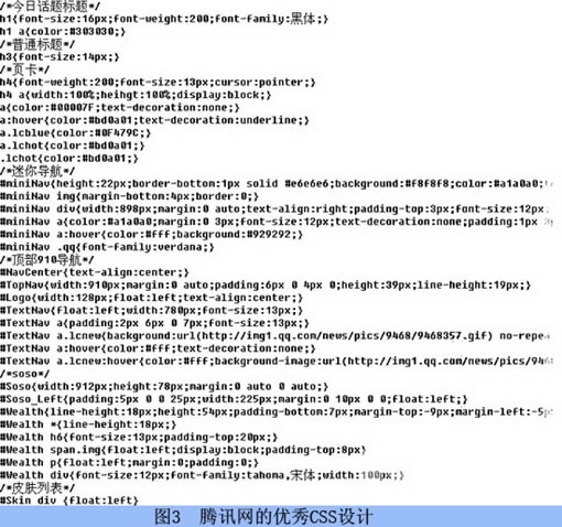 而CSS的书写方式也因设计师的不同而各有千秋,在此,我们强调CSS的设计关键在于代码的缩略与复用:缩略能使CSS代码更加简明扼要,CSS文件也能缩小体积;复用则是提高代码的利用率,以最少的代码实现最高的重复使用效率。如图3所示,腾讯网的CSS设计就十分优秀。