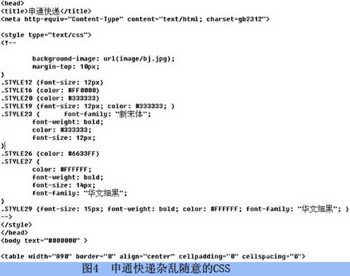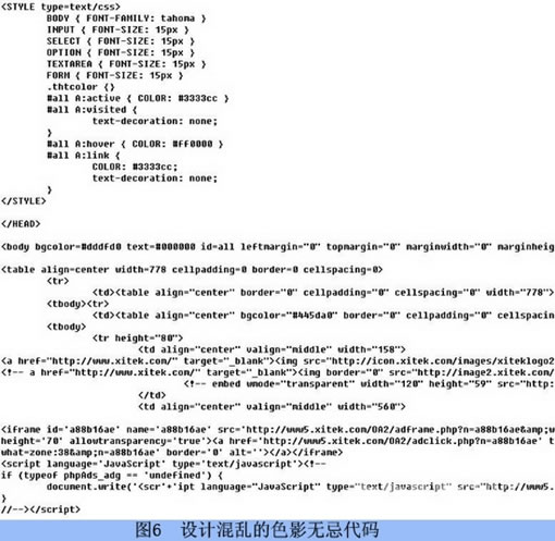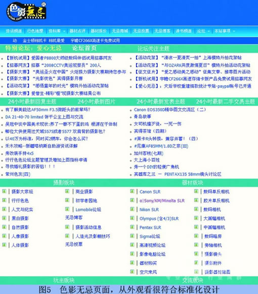 1.样式表统一:样式表分为内联样式表和外联样式表,成型的网站架构要求对样式表统一管理,所有的样式表都需要独立出来,作为一个或几个外联样式表文件;除非是极特殊的情况,该CSS只在这一个页面中出现,不会有另外的页面需要复用它,那么可以考虑使用内联,而内联样式很多时候会被视为极不专业的做法。如图5,色影无忌网站的设计从外观看很符合标准化设计,但从图6我们可以看出色影无忌的代码设计非常混乱。