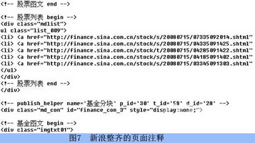 2.注释:再科学、再规范的代码,也不见得能一眼就被其他人读懂,所以这个时候需要代码注释。CSS的注释很简单,在HTML里的DIV注释因为其层级嵌套关系的问题,需要使用<!—头部begin-->和<!—头部end-->的方式进行包含处理,这样能使代码更加模块化。如图7所示,新浪的页面注释就很整齐。