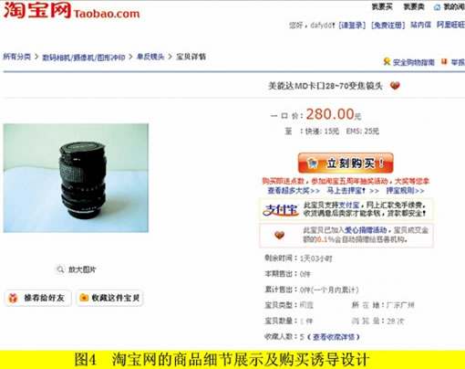 淘宝网的用户体验在业内应该算是典范,作为国内最成功的C2C网站,淘宝的用户体验设计也在不断地完善之中。由图4我们可以了解淘宝网的商品细节展示及购买引导设计,以淘宝的产品展示页为例,从单件出售物品的信息传递来看,产品照片右侧清晰写明了一口价和运费,紧接下来就是一个硕大的“立刻购买”按钮,然后再将需要写明白的物品信息及参数等等一一罗列。这个页面就具有很明显的用户诱导性,因为淘宝需要的就是货品的成交量。