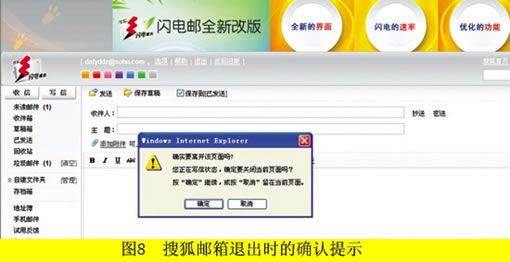 如图8是搜狐邮箱退出时的确认提示,用户在编辑邮件的同时,如果点击了任何离开编辑状态的操作,就会看到弹出提示,询问是否确定放弃正在编辑中的邮件,如果用户在编辑重要邮件的时候进行了误操作,那么这样的细节就能够帮助他们避免损失,这样会使用户对该邮件系统更为信任。