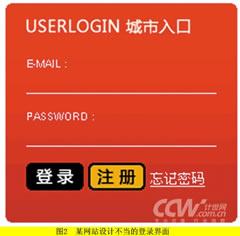 图1是myspace失败的登录按钮设计。myspace上线后,无数用户表达了对图1这个极不合适的登录按钮设计的不满,这个重要的元素,被极不显眼地淡化在左侧,右侧是以鲜亮颜色突出表现的注册按钮。很多人在填写完账号密码之后,迅速且不假思索地点击了“注册”。这是一个失败的典型,但是这并不是偶然的,除了myspace,还有很多登录设计是这样的,如图2所示的某网站登录界面。