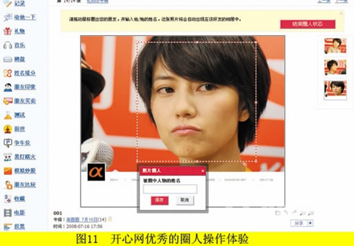图11是开心网圈人操作的优秀体验,圈人这个创意应该是来自于照片网站Flickr,开心网在细节上对其发扬光大,使得“圈人”的体验度更强,使用起来更加得心应手。