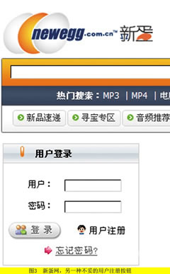 图3是新蛋网的登录区域设计,在新蛋网的登录区域设计中,设计师把用户注册以链接的形式设计,而不设计成按钮,这样也是能明显区分开功能区域的。但是这个设计也不见得稳妥,因为它的登录按钮水平向左,超出了用户名密码的区域,使用户的鼠标轨迹不具有连贯性。应该把“登录”放置在右边,把“用户注册”放到左边为宜。