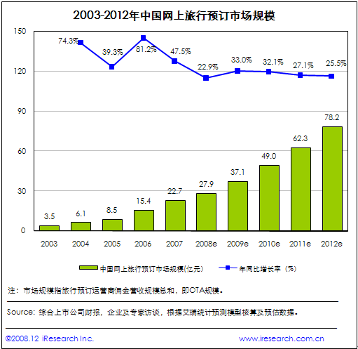 iResearch艾瑞咨询即将推出的《2008-2009年中国网上旅行预订行业发展报告》统计显示,2008年中国网上旅行预订市场规模为27. 89亿元,相比2007年的22.73亿元同比增长22.7%,同期增速放缓。