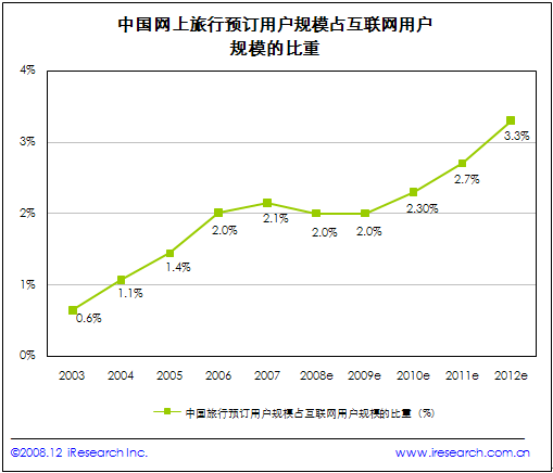 艾瑞咨询同时根据CNNNIC统计的中国互联网用户数量,截止2008年底中国互联网用户人数接近3亿人,网上旅行预订用户数量占互联网用户数量的比例为2%,与2007年基本持平。虽然08年使用网上旅行预订服务的用户有33.3%的增长,但由于新晋互联网初级用户众多,而旅行预订又非常态化的应用,所以这一比例基本未变。