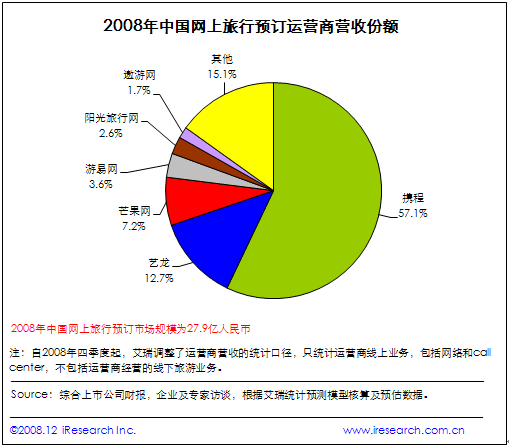 2008年,中国网上旅行预订市场仍然保持着携程一家独大,艺龙、芒果占据第二阵营,其他厂商瓜分剩余市场的竞争格局。