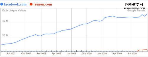二、中文SNS“大局已定”?最近很多人说中文sns大局已定,基本没什么市场空间了。对于这种说法,先请看下面2张图:以目前国内最大的独立sns网站人人网来说,从google trends可以看出独立uv在300万左右,facebook独立uv在6000万左右(这个数据可能低估了人人网的uv,但因为是同等条件下比较,所以我们暂时忽略)。如图1