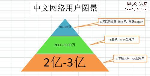 B类用户,在金字塔中间,他们是2000-3000万左右所谓“白领”用户。他们一般受过良好教育,在一线城市,对互联网应用能跟风使用,但并不娴熟。对于这个阶层,互联网服务需要本地化,具有“中国特色”。如果用一种互联网服务代表他们,他们是活跃的msn用户
