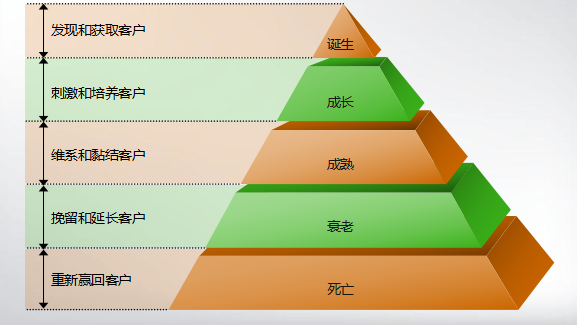 传统的“客户生命周期“,基本上包含五个阶段,不同阶段目标如图所示: