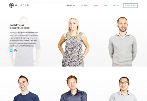 一个好故事并不需要做的太复杂。Humaan 就很直接的借助团队照片和悬浮动效来讲述故事,帮助访客了解这个团队的成员。这种设计简单而有效。(注意悬浮状态下每个成员姿势和表情的变化,非常有意思)